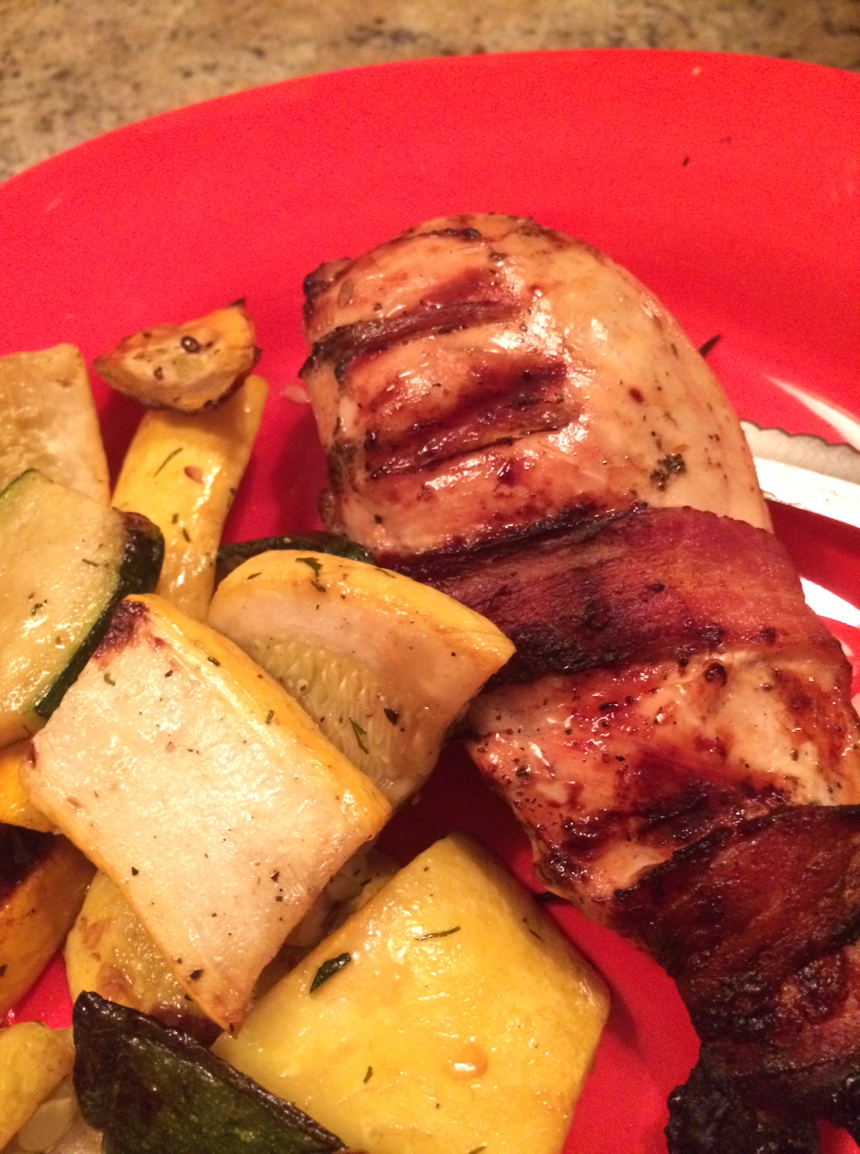 For breakfast I grabbed a grande iced coffee from Starbucks.  I’ve been drinking it black lately, but today I added some Almond Milk that my work so kindly has in the fridge.  I brought in fresh blueberries that I got over the weekend and drizzled them with some of my homemade maple almond butter.  I threw it in the microwave for about 15 seconds…more like dessert if you ask me! photo 3 (27) At about 1PM I eagerly got my salad out and ate at my desk.  I try to wait until at least 1ish to eat lunch but always end up so hungry by the time that rolls around.  I had a pretty simple salad of kale, spinach, cherry tomatoes, avocado, and hard boiled eggs. photo 4 (19) An hour or two after lunch I snacked on these delicious coconut chips.  I’ve been loving these lately!  They are only $2.99 at Whole Foods and taste like they shouldn’t be good for you – but are! photo 5 (19) After my snack I popped in a half piece of gum.  I think I chew gum out of boredom or habit at work.  For that reason I started chewing halves so at least I minimize how many pieces I chew in a day! photo 1 (28) Right before I left work I decided to have this little clementine.  I don’t eat oranges too often, mainly because I think I’m too lazy to peel them.  Little did I know how easy clementines are to peel! I got it today in one shot!  I came down with a cold this week so thought I could use the Vitamin C. photo (14) This isn’t food but it’s much prettier than the other pictures in this post.  I snapped this on my run tonight.  I’m obsessed with my new running spot near my new house.  Yes this is instagrammed, but it was just as if not more beautiful in person! photo 2 (32) After my run I grilled up a few pieces of chicken for lunches for the rest of the week.  I decided to wrap a piece of bacon around one piece and have it for dinner along with some left over grilled squash.  It was dee-lish! I ended my night with a nice square of 80% dark chocolate.  I have an addiction. Well that was fun! Maybe I should do this every week!