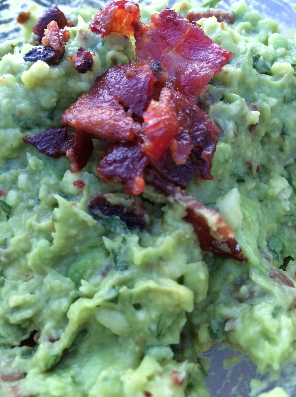 Cook your bacon in a pre-heated 350 degree oven for 15 minutes or until crispy.  While the bacon is cooking cut open your avocados, remove the pits, and add the insides of them into a bowl (it will be easier if they are diced).  Use a fork to start mashing the avocado.  Add in the juice of one lime and continue to mash.  Add your green onion and salt and pepper to the bowl.  When your bacon is done cooking cut it up into small pieces and mix in to the guacamole.  Done! Enjoy with almond crackers, quinoa chips, or whatever your little heart desires.
