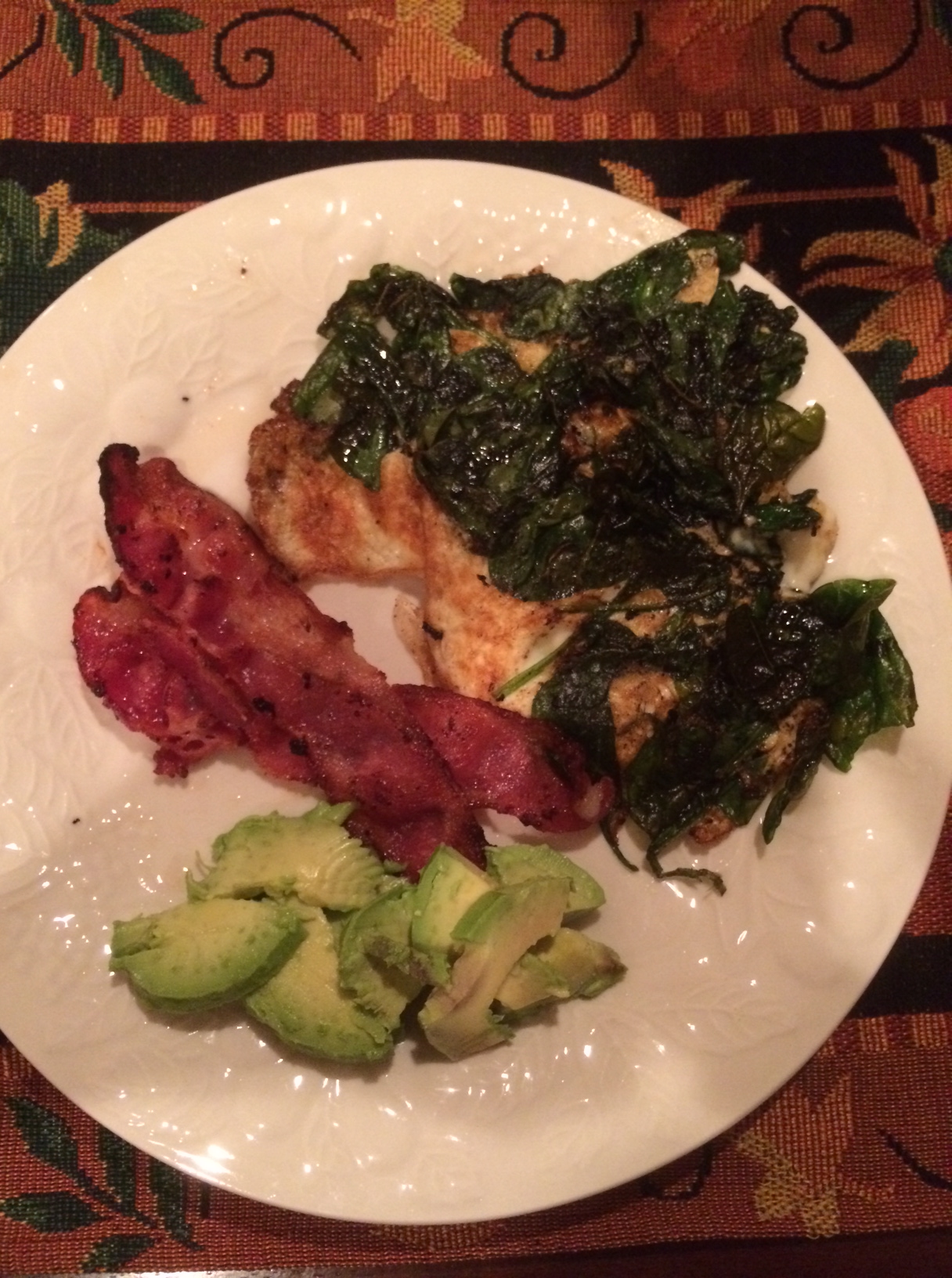 For dinner, I had the usual two bacon, two fried eggs and spinach, and avocado.  Never gets old!  I’m loving these fall place mats I recently bought from Big Lots – only $2!