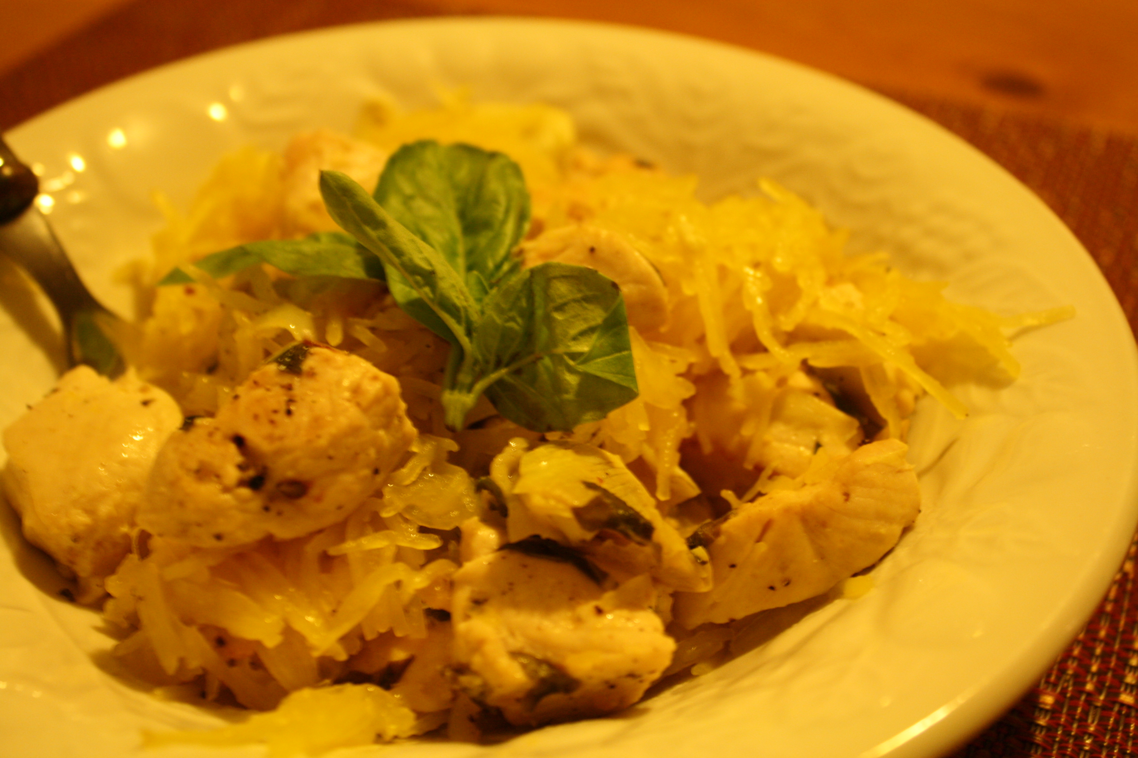 Once your squash is done and you are able to pick it up, fork the spaghetti into a big bowl. Squeeze the other half of your lemon on to your spaghetti squash. Add in chicken mixture and mix together with spaghetti. Enjoy!