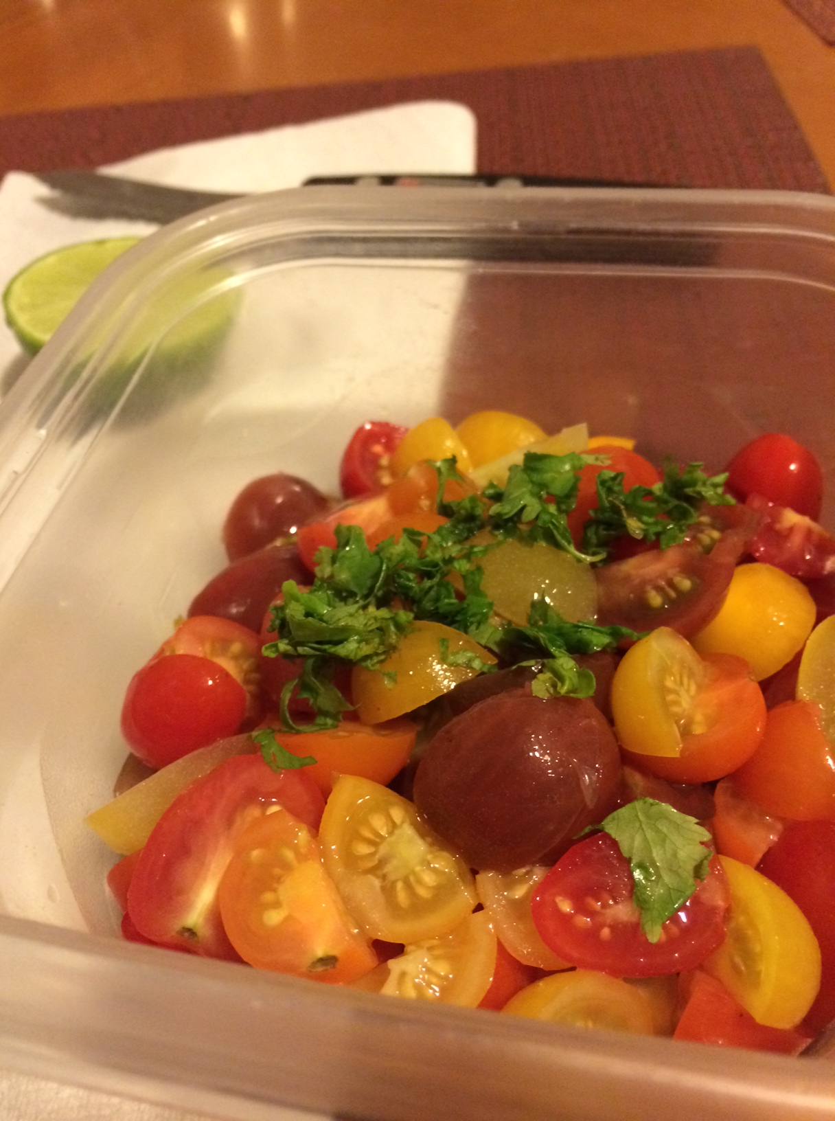 First prepare your heirloom tomato salsa. Cut the tomatoes into fourths and throw in a bowl. Once they are all cut up squeeze your lime over them. Cut up your cilantro and add along with salt, pepper, and garlic to taste.